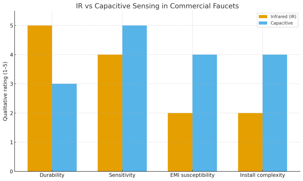 Modern commercial and institutional restrooms treat sensor faucets as infrastructure, not fixtures. For architects and engineers, the choice between infrared (IR) and capacitive sensing is less about “touchless convenience” and more about reliability under abuse, coordinated integration with plumbing and electrical systems, and documented compliance with codes and standards (ADA, WaterSense, CALGreen, ASME/CSA).